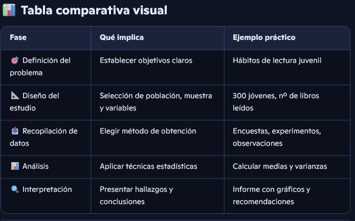 Para que un estudio estadístico sea fiable y válido, debe seguir una serie de fases bien definidas. Aunque el tipo de estudio y el objetivo pueden variar, hay aspectos generales que siempre debemos tener en cuenta: